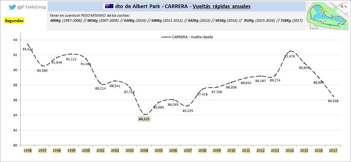 Evolución vueltas rápidas en CARRERA en #AlbertPark entre 1996-2017